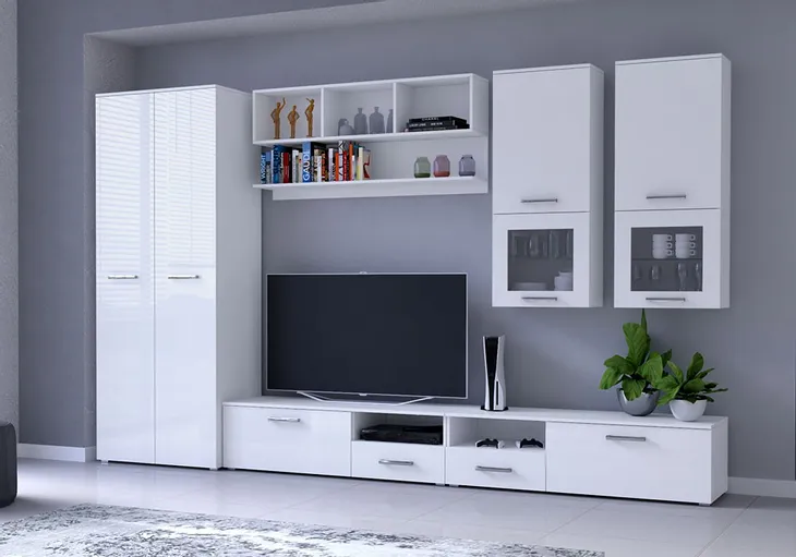 Meblościanka biały połysk to idealny zestaw do salonu, który chcemy urządzić w nowoczesnym stylu. Nadaje się zarówno do małych jak i dużych, przestronnych pomieszczeń. Fronty wykonane zostały z płyty laminowanej w połysku lub strukturze drewna, która nadaje nowoczesności i rozświetla wnętrze. Szklane wstawki w witrynach dodają elegancji i nowoczesności. Istnieje możliwość dokupienia oświetlenia LED.Kapak w meblościance w kolorze białym
