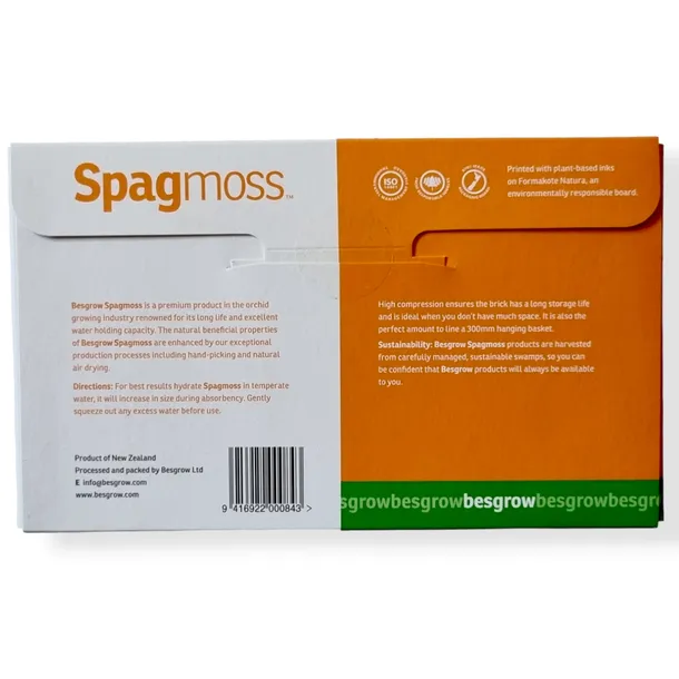 Spagmoss to najlepszy mech dla roślin. Jest to czysty, naturalny, odnawialny produkt pozyskiwany w sposób zrównoważony z terenów podmokłych na dziewiczym zachodnim wybrzeżu Wyspy Południowej Nowej Zelandii. Mech torfowiec jest szeroko stosowany do uprawy storczyków i innych roślin kochających wilgoć. Można go stosować również jako wypełnienie do palików podtrzymującyh rośliny.