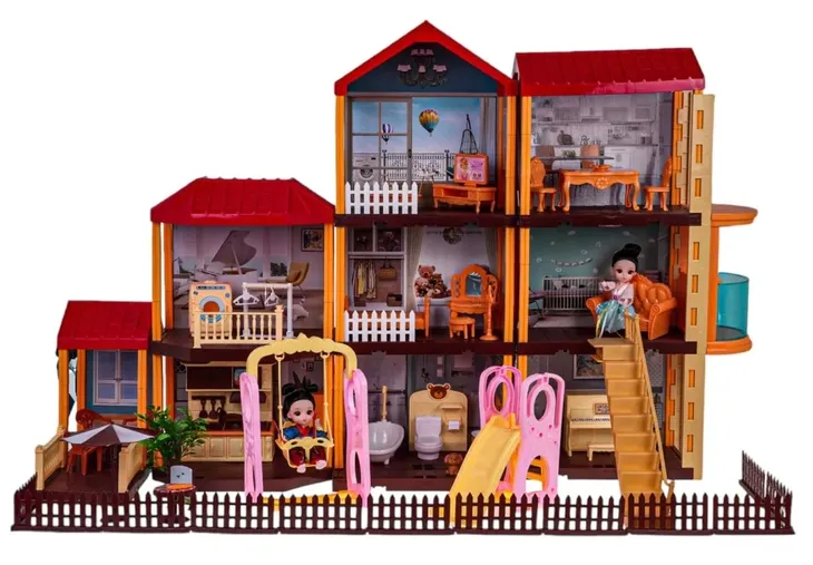 Magiczny domek dla lalek to propozycja dla dzieci powyżej 3-go roku życia. Zestaw zawiera aż 251 elementów: domek, meble, samochód, akcesoria i dwie laleczki. Elementy zestawu wykonano z najlepszej jakości plastiku w żywych kolorach przyciągających wzrok dziecka i zachęcających do zabawy. W domu znajdziemy takie pomieszczenia jak: kuchnia, łazienka, pokój muzyczny, salon, sypialnia, garderoba, pokój dzienny. Domek ogrodzony jest płotkiem, przed domkiem znajduje się strefa zabaw dla dzieci ze zjeżdżalnią i huśtawką oraz strefa wypoczynku ze stoliczkiem, krzesełkami i parasolem. Domek posiada oświetlenie, w zestawie znajduje się 5 lamp, zasilanych bateriami typu AG13, łącznie 15 sztuk.