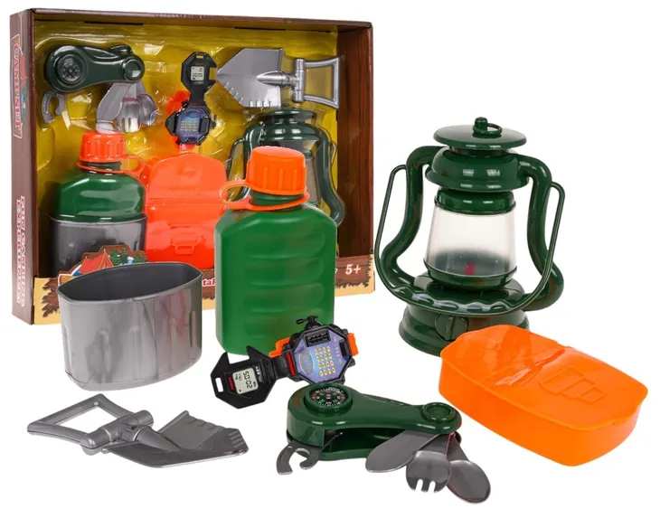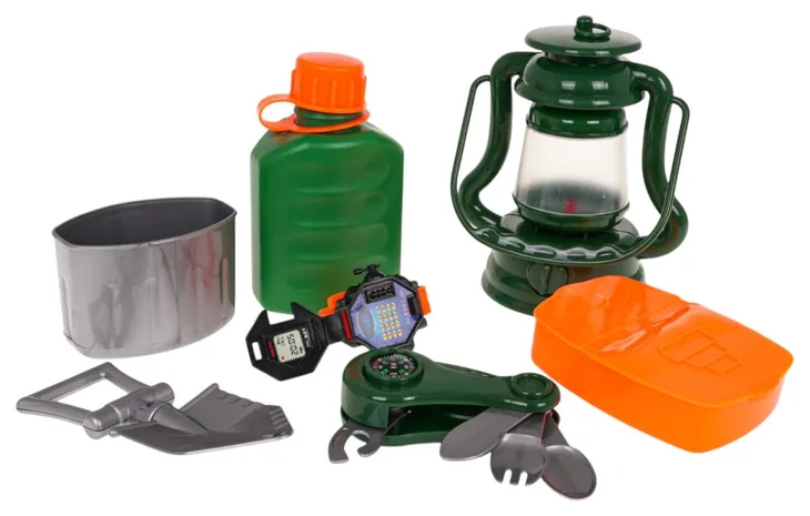 Zestaw kempingowy dla dzieci od 3-go roku życia. W skład zestawu wchodzi: lampa, manierka, niezbędnik, zegarek, pojemnik na żywność oraz łopatka. Z tym zestawem dziecko poczuje się jak prawdziwy odkrywca. Lampa zasilana jest bateriami typu 3 x AG13 (w zestawie).