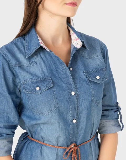 Kobieca jeansowa tunika/sukienka skrojona na wzór męskiej koszuli - szmizjerka to świetna alternatywa dla zwykłych topów czy bluzek. Idealnie komponuje się z leginsami lub spodniami o wąskich nogawkach jak również świetnie prezentuje się w połączeniu z krótkimi szortami.