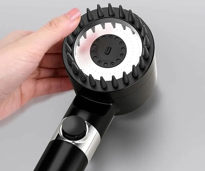 - [3+1 rodzaje strumienia i silikonowa szczoteczka do masażu]Filtrująca słuchawka prysznicowa MEKO oferuje cztery indywidualne warianty strumienia: deszcz, spray, mieszany i puls. Zaledwie jednym naciśnięciem przycisku bezpośrednio na słuchawce można łatwo przełączać tryby. W trybie spray strumień wody przypomina uczucie miękkiej bawełny - absolutnie przyjemne i relaksujące, idealne do łagodzenia napięć mięśniowych. Tryb pulsacyjny jest z kolei szczególnie skuteczny w czyszczeniu toalet lub odpływów. Element masażowy z silikonu na głowicy prysznica nadaje się nie tylko doskonale do masażu skóry głowy, ale także do pielęgnacji innych części ciała.