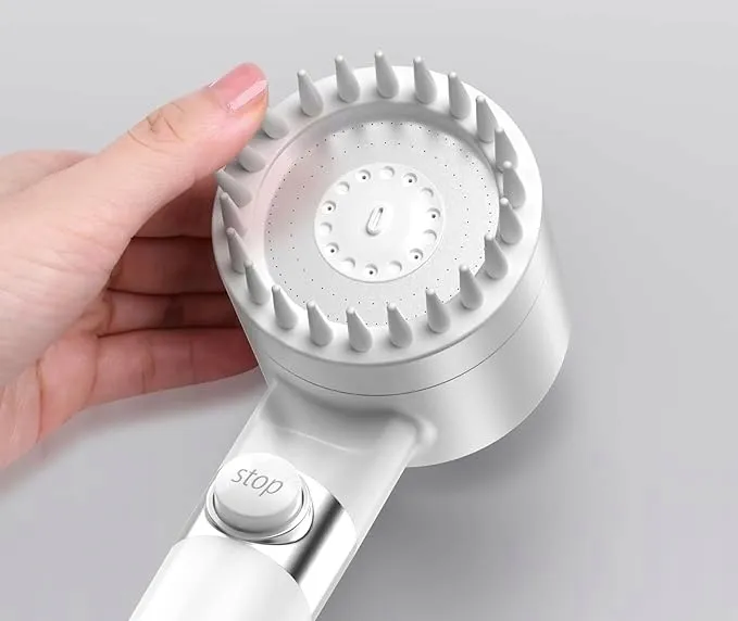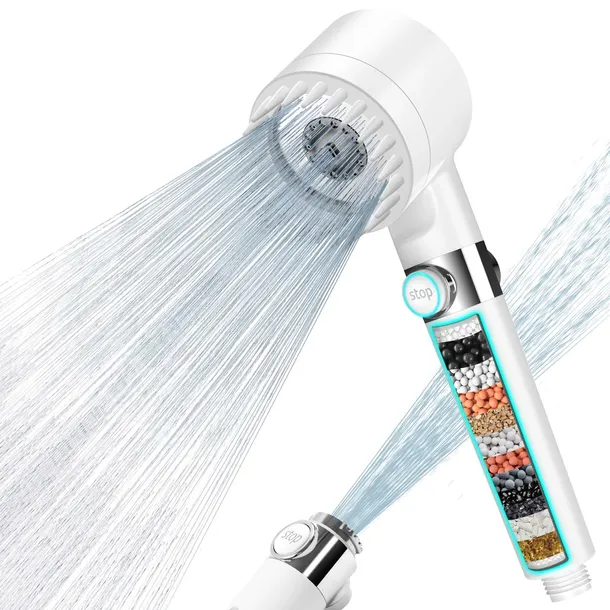 - [3+1 rodzaje strumienia i silikonowa szczoteczka do masażu]Filtrująca słuchawka prysznicowa MEKO oferuje cztery indywidualne warianty strumienia: deszcz, spray, mieszany i puls. Zaledwie jednym naciśnięciem przycisku bezpośrednio na słuchawce można łatwo przełączać tryby. W trybie spray strumień wody przypomina uczucie miękkiej bawełny - absolutnie przyjemne i relaksujące, idealne do łagodzenia napięć mięśniowych. Tryb pulsacyjny jest z kolei szczególnie skuteczny w czyszczeniu toalet lub odpływów. Element masażowy z silikonu na głowicy prysznica nadaje się nie tylko doskonale do masażu skóry głowy, ale także do pielęgnacji innych części ciała.