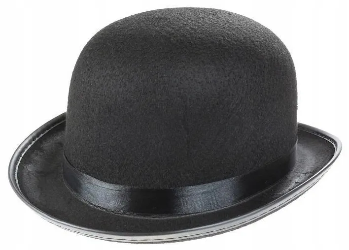 MELONIK czarny, gładki Obwód: 57 cm Melonik wykonany z czarnego przyjemnego w dotyku materiału, na dole zdobiony czarną wstążką. Usztywnione rondo kapelusza zabezpiecza przed nieefektownym opadaniem i pozwala na pełną swobodę.
