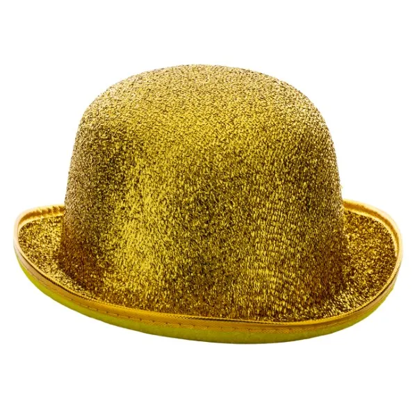Melonik złoty błyszczący wykonany jest z usztywnianego materiału, na zewnątrz pokryty brokatem.