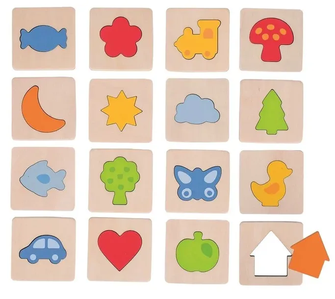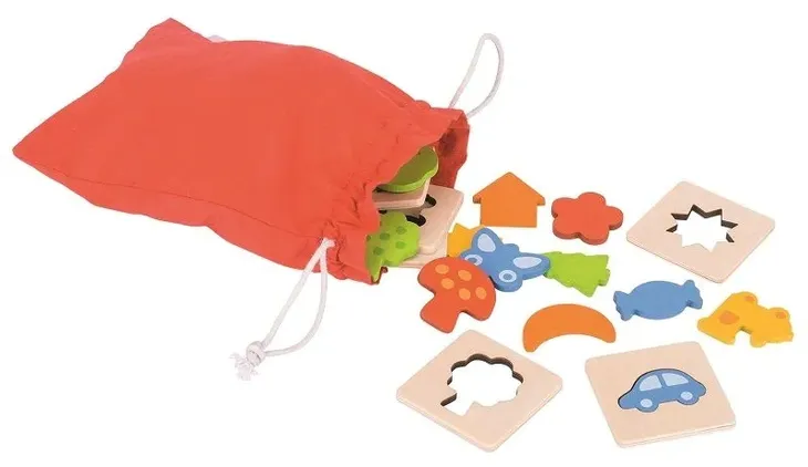 To proste. Każda para składa się z kwadratowego elementu z wyciętym w środu kształtem oraz drugiego klocka, który pasuje do otworu. Na początek należy rozłożyć klocki z pustymi otworami na blacie, a następnie za pomocą dotyku znaleźć w woreczku pasujący do niego środek. Możemy grać na kilka sposobów: