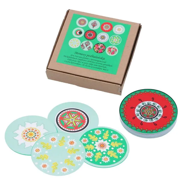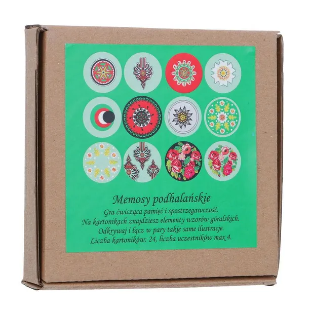 Zawartość zestawu:24 kartoniki (12 par) z elementami inspirowanymi sztuką PodhalaEkologiczne, biodegradowalne pudełko (10,5 × 10,5 × 2 cm)Możliwość gry dla 2-4 osób