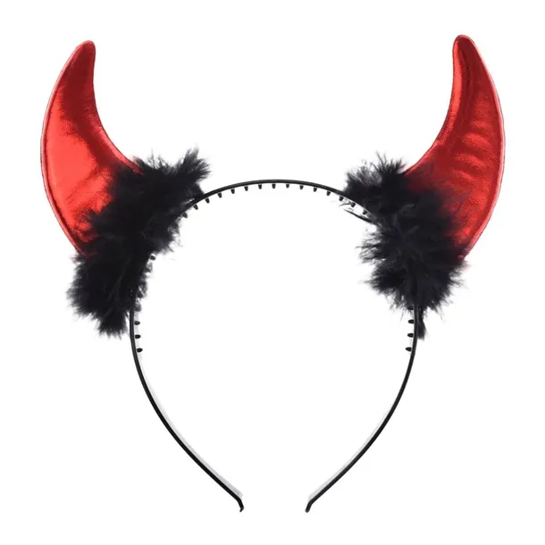 Czerwone, błyszczące rogi wykonane z materiału o metalicznym połysku osadzone na opasce. W miejscu łączenia rogu z opaską zostało dodane ozdobne wykończenie z czarnych delikatnych piórek. Element kostiumu na halloween, bal karnawałowy bądź samodzielny gadżet. Rozmiar opaski to 21 cm.