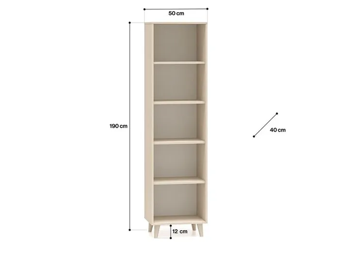 - Korpus:Odcień Piasek pustyni – jasny, neutralny kolor, który rozjaśni wnętrze i doskonale wpasuje się w różne aranżacje.Nóżki:Wysokość: 12 cm, kolor beż piaskowy – stabilne i stylowe nóżki nadają meblowi lekkości i pozwalają łatwo utrzymać czystość pod regałem