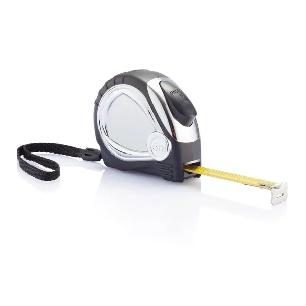 Miara 5 m, funkcja auto stop, żółta taśma o szerokości 19 mm, chromowana obudowa z uchwytem z miękkiej gumy, posiada klip do paska i pasek na rękę