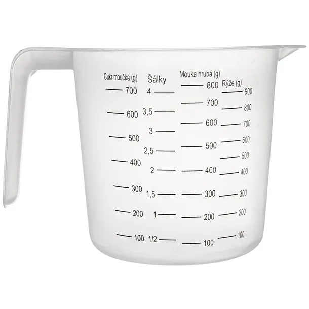 FUNKCJONALNA - Posiada miarki do cieczy, cukru, mąki, oleju, maku, ryżu. Miarka posiada podziałkę w mililitrach od 200 do 1000 ml oraz w gramach od 100 do 900 g, podziałka jest co 50 ml lub co 100 g. Pojemność maksymalna kubka wynosi 1 l.