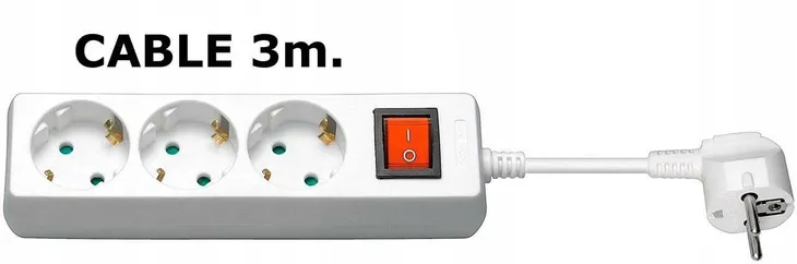 3-kierunkowa listwa zasilająca Schuko z kablem długości 3m, wyposażona w podświetlany przełącznik z ochroną dla dzieci do wyłączania całej listwy zasilającej.