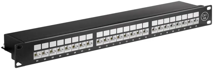 Microconnect PP-022. Złącze(a): RJ-45, Obsługiwane typy kabli: Cat6a. Kolor produktu: Czarny, Typ montażu: Montaż półkowy, Pojemność stelaża: 1U. Szerokość produktu: 483 mm, Wysokość produktu: 44 mm, Głębokość produktu: 107 mm. Szerokość opakowania: 150 mm, Głębokość opakowania: 520 mm, Wysokość opakowania: 70 mm