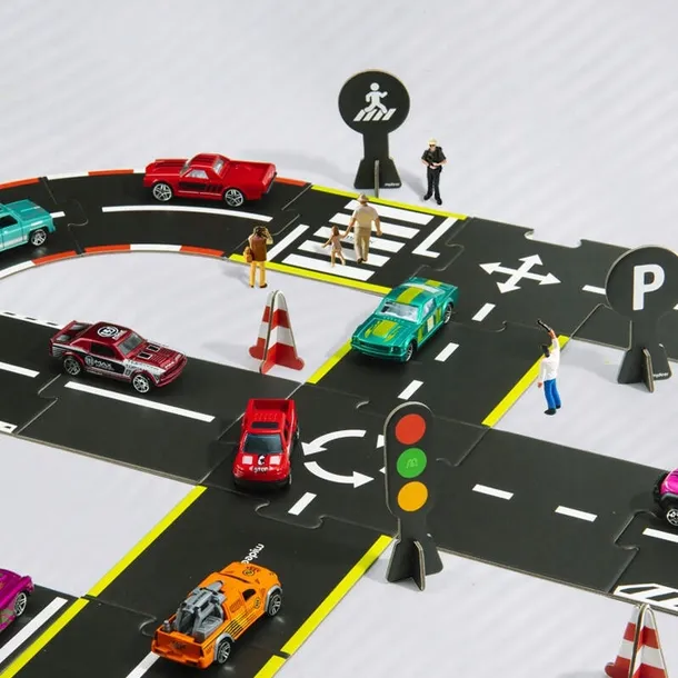 Wymiary toru zależą od sposobu ułożenia puzzli, co daje dziecku swobodę w tworzeniu różnych tras.