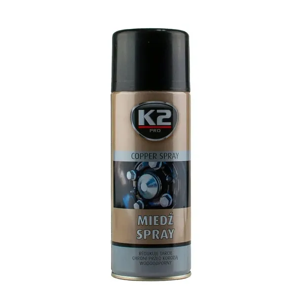 K2 MIEDŹ SPRAY to wysokotemperaturowy, szybkoschnący smar miedziowy w aerozolu o pojemności 400ml. Jego głównym zadaniem jest redukcja tarcia części metalowych, zapobieganie zacieraniu, trzeszczeniu i skrzypieniu. Skutecznie chroni śruby, nakrętki oraz łożyska przed korozją, a także poprawia szczelność połączeń gwintowych.