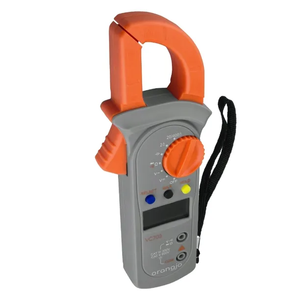 Miernik cyfrowy cęgowy ORANGJO. Pomiary: natężenie: DC, napięcie AC/DC, rezystancja, test kondesatorów, test diod, test ciągłości obwodu. Buzzer. Funkcja HOLD. Zasilanie: 2 x AAA (w zestawie). Opakowanie: blister