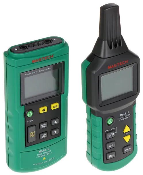 Miernik MS-6818 pozwala na identyfikację oraz śledzenie przewodów umieszczonych w ścianach lub zakopanych pod ziemią. Metoda działania miernika pozwala również na śledzenie położenia innych metalowych instalacji, jak np. rury wod-kan, elementy instalacji grzewczych (w tym podłogowych) i inne. Ponadto, miernik MS-6818 pozwala również wykrywać uszkodzenia i zwarcia przewodów elektrycznych. Urządzenie umożliwia pracę zarówno w odłączonym obwodzie, jak i przy obecności napięcia sieciowego (AC oraz DC). W przypadku obecności napięcia sieciowego, zarówno nadajnik, jak i odbiornik wyświetlą na ekranach ostrzeżenie o pracy przy obwodzie pod napięciem. Nadajnik posiada też możliwość pomiaru napięcia w obwodzie w zakresie 12V ... 400V AC/DC. Maksymalny zasięg, z jakiego odbiornik jest w stanie zlokalizować przewód wynosi 2m, co pozwala również na określenie położenia instalacji znajdujących się dość głęboko pod powierzchnią ziemi. Możliwe jest użycie większej ilości mierników MS-6818 równocześnie np. w celu ustalenia pomieszczeń zasilanych z różnych faz sieci elektrycznej. Nadajniki mają możliwość transmisji różniących się sygnałów, które są identyfikowane przez odbiornik. Zarówno nadajnik, jak i odbiornik identyfikują te sygnały za pomocą liter: F, E, H, D, L, C, O, A.