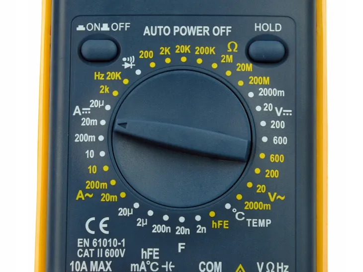 Umożliwia pomiar: napięcia AC, napięcia DC, prądu AC, prądu DC, rezystancji, częstotliwości, pojemności, temperatury oraz wzmocnienia tranzystora (hFE)