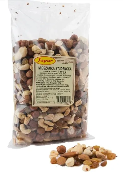 Mieszanka studencka to połączenie chrupiących orzechów i słodkich rodzynek – idealna na zdrową przekąskę w ciągu dnia. Naturalna energia z migdałów, nerkowców, orzechów ziemnych, brazylijskich i laskowych oraz rodzynki dla zastrzyku słodyczy.