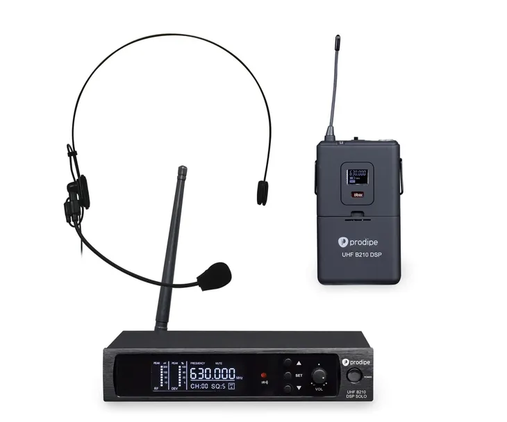Mikrofonowy zestaw bezprzewodowy składający się z headsetu i bazy.