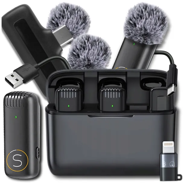 ✔️ Kompletny zestaw gotowy do pracy – 2 mikrofony nadajniki, odbiornik USB-C, adapter Lightning i etui z ładowaniem