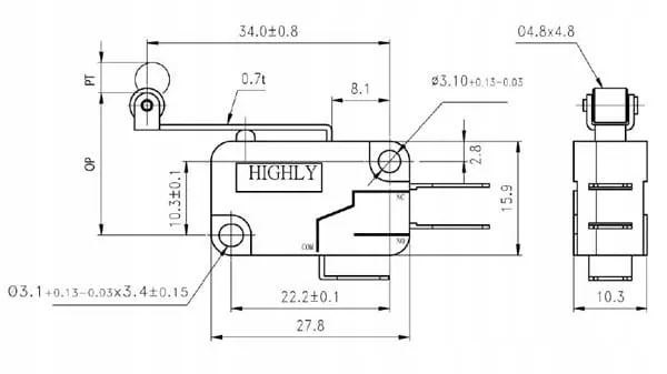 Mikroprzełącznik; VS15N06-1C; dźwignia z rolką; 25mm; 1NO+1NC wspólny pin; szybkie; konektory 6,3mm; 15A; 250V; Highly; RoHS