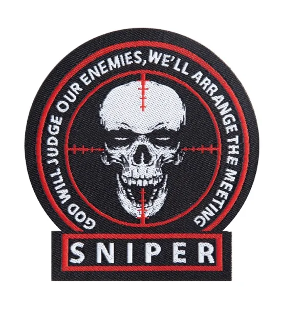Naszywka wykonana z poliestru odpornego na przetarcia i rozdarcia. Przedstawia celownik wymierzony w czaszkę z napisem „Sniper”.