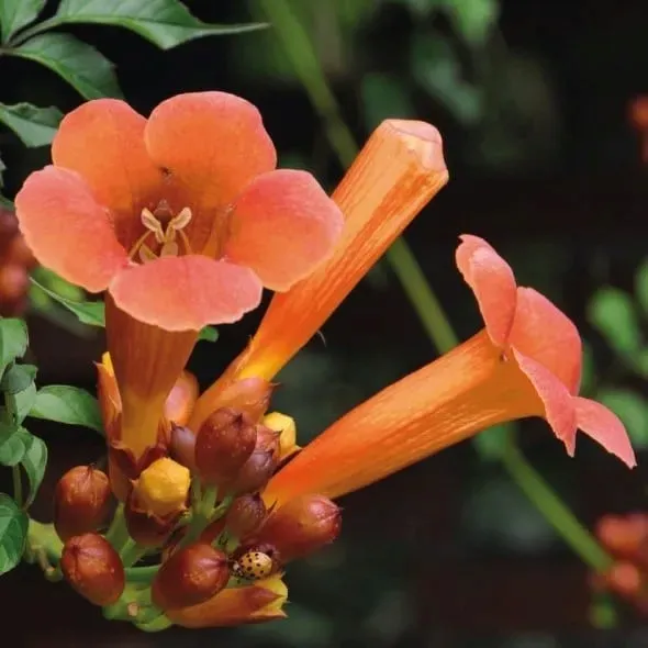 Kwiaty: Trąbkowate, rozszerzone na wierzchołku, mają 6-8cm długości i 3-5 cm średnicy, o intensywnie pomarańczowej barwie.