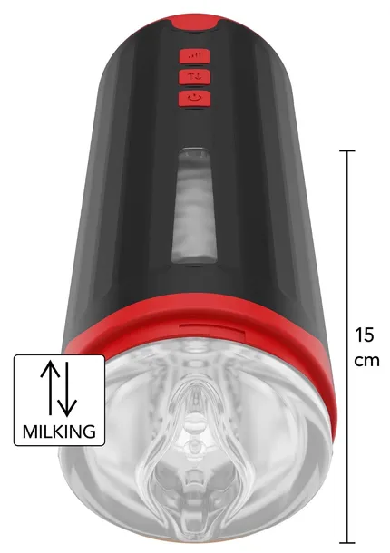 Specyfikacja: – Długość całkowita: 28 cm – Długość insertowalna: 15 cm – Średnica insertowalna: 3,5 cm – Materiał: obudowa – ABS | rękaw – TPE – Funkcje: wibracje + ruchy dojenia – Tryby wibracji: 5 – Tryby milking: 5 – Wodoodporność: IPX4 (odporny na zachlapania) – Zasilanie: akumulator litowo-jonowy (ładowalny)