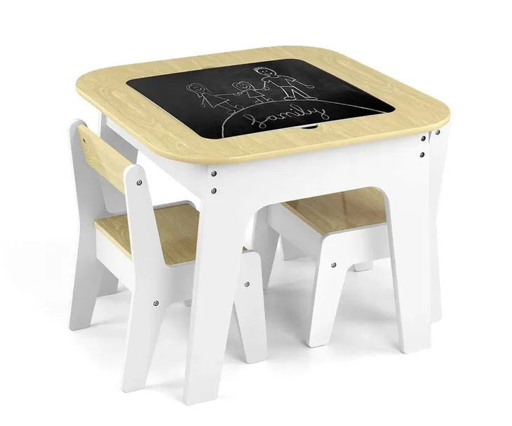 Zestaw Olaf Blocks wyróżnia się unikalnym blatem – jedna strona stołu jest pokryta powierzchnią dostosowaną do klocków konstrukcyjnych, co sprawia, że stolik staje się doskonałą bazą do budowania. Po drugiej stronie znajduje się gładka powierzchnia, idealna do rysowania, pisania lub innych zabaw plastycznych. Blat jest wyjmowany, a pod nim znajduje się przestronny schowek, który ułatwia przechowywanie zabawek, klocków czy przyborów plastycznych, dzięki czemu utrzymanie porządku staje się prostsze.