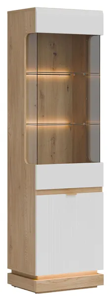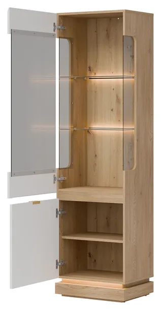 Witryna ML05 z kolekcji MILTON to wyższa wersja modelu ML04, oferująca jeszcze więcej elegancji i funkcjonalności. Fronty MDF w matowym wykończeniu, dostępne w kilku modnych kolorach, zostały wzbogacone o subtelne, pionowe frezowanie w dolnej części, które nadaje meblowi nowoczesnego, a zarazem wyrafinowanego charakteru. Minimalistyczne, złote uchwyty dodają elegancji, a opcjonalne oświetlenie LED w części ekspozycyjnej wprowadza przyjemny, nastrojowy klimat. Górna, przeszklona część witryny umożliwia efektowne wyeksponowanie dekoracji, szkła lub pamiątek, natomiast zamykane szafki w dolnej części oferują przestronną i praktyczną strefę przechowywania. Korpus w dekorze dąb cremona torro wprowadza ciepły, naturalny akcent i doskonale komponuje się z każdą wersją kolorystyczną frontów, tworząc harmonijną i estetyczną całość. Witryna wyposażona została w system cichego domyku, który zapewnia wysoki komfort użytkowania. To idealny mebel do salonu, jadalni lub kuchni, który łączy styl, funkcjonalność i ponadczasową klasę.