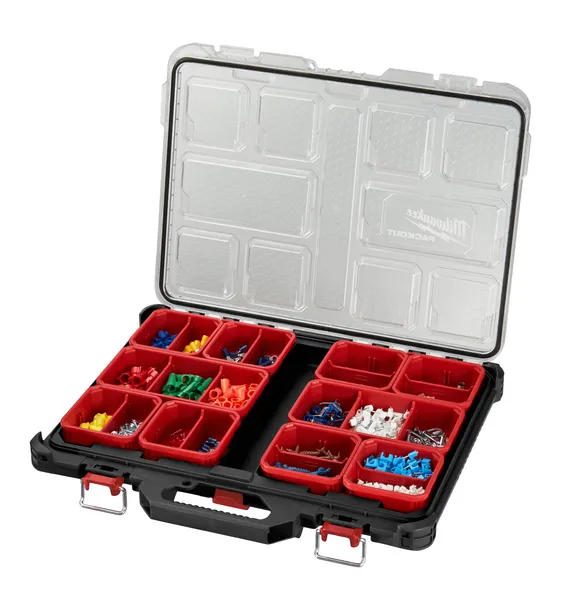 MILWAUKEE ORGANIZER SLIM PACKOUT - DUŻYOpis:Część systemu PACKOUT przechowywania i organizacji narzędzi oraz akcesoriów od Milwaukee.Wykonany z odpornych na uderzenia polimerów, co gwarantuje maksymalną trwałość w miejscu pracy.Wyposażony w 2 duże oraz 8 małych pojemników.Specjalnie ukształtowana pokrywa zapobiega przemieszczaniu się zawartości pojemników w trakcie transportu.IP65- ochrona przed pyłem, zanieczyszczeniami oraz wodą.MILWAUKEE Organizer Slim Packout 4932471064 Kolor dominujący czarnyMILWAUKEE Organizer Slim Packout 4932471064