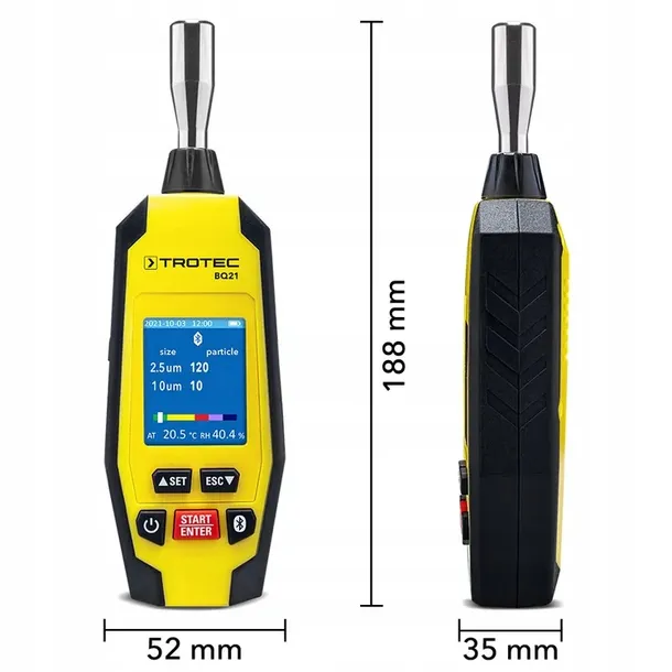 Urządzenie pomiaru cząsteczek z pamięcią Flash na 5000 pomiarów rejestruje całościowe ważne z punktu zdrowia parametry klimatyczne pomieszczenia, takie jak temperatura powietrza, wilgotność powietrza oraz cząsteczki pyłu - 10mikrometra, według międzynarodowo stosowanego standardu PM (Particulate Matter) nazywane są one jako PM10 i PM2.5 (ilość i wielkość oraz stężenie masy cząsteczek w powietrzu). Stężenie w powietrzu przedstawione zostaje na 2,0-calowym kolorowym wyświetlaczu, do wyboru numerycznie w mikrogramach na metr sześcienny (µg/m sześć.) powietrza w pomieszczeniu lub jako liczba cząsteczek. Dodatkowo wskaźnik barograficzny w postaci kolorowych słupków informuje o statusie aktualnego zanieczyszczenia cząsteczkami.