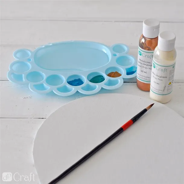 Mini paleta malarska, plastikowa, owalna. Zawiera w sumie 16 dołków (1 główna komora, 7 dużych, 2 średnie i 6 małych) i dwa miejsca na pędzle. Paleta w kolorze niebieskim.