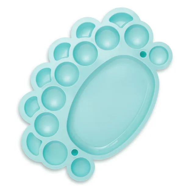 Mini paleta malarska, plastikowa, owalna. Zawiera w sumie 16 dołków (1 główna komora, 7 dużych, 2 średnie i 6 małych) i dwa miejsca na pędzle. Paleta w kolorze miętowym.
