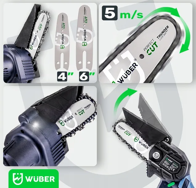 Ta wysokiej jakości mini piła gałęziowa akumulatorowa Wuber z wysięgnikiem 250 cm wyróżnia się nie tylko kompaktowym i ergonomicznym designem, ale także wyjątkową wydajnością. Wyposażona w dwa akumulatory Li-ion 21V o pojemności 2000mAh oraz dwie prowadnice (4" i 6"), umożliwia precyzyjne przycinanie gałęzi i małych drzewek z prędkością łańcucha 5 m/s, zapewniając niezawodne rezultaty w każdych warunkach.