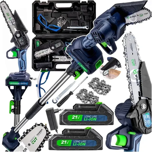 Ta wysokiej jakości mini piła gałęziowa akumulatorowa Wuber z wysięgnikiem 250 cm wyróżnia się nie tylko kompaktowym i ergonomicznym designem, ale także wyjątkową wydajnością. Wyposażona w dwa akumulatory Li-ion 21V o pojemności 2000mAh oraz dwie prowadnice (4" i 6"), umożliwia precyzyjne przycinanie gałęzi i małych drzewek z prędkością łańcucha 5 m/s, zapewniając niezawodne rezultaty w każdych warunkach.