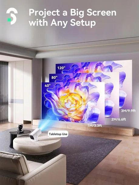 Zabierz duży ekran wszędzie: dzięki maksymalnemu rozmiarowi ekranu 150 cali przenośny projektor SK1 zapewnia kinową jakość, którą możesz zabrać ze sobą wszędzie. Nasza inteligentna technologia adaptacji do środowiska zapewnia dopasowanie ekranu, automatyczną korekcję efektu trapezu i ręczne ustawianie ostrości w zaledwie 3 sekundy.