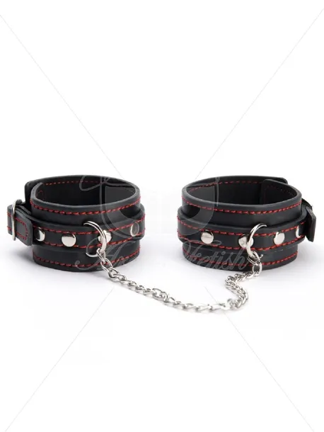 Klasyczne czarne mini mankiety wykonane z bezniklowego okucia i skóry PU z niewielkim skrętem przeszycia czerwoną nitkąSą bezzapachowe, bardzo trwałe i wystarczająco wytrzymałe do wszelkiego rodzaju zabaw w łóżkuPołączenie między nimi jest za pomocą mocnego łańcucha krawężnikowegoKońcówki są przeszyte czerwoną nicią, dzięki czemu będą służyć bardzo długoRozmiar jest idealny dla każdegoW zestawie ekskluzywne czerwono-czarne pudełko z srebrnym logoWymiary pudełka to 30x125x38 cmDługość mankietu: 26 cmSzerokość mankietu: 4 cmDługość łańcucha metalowego: 17 cm