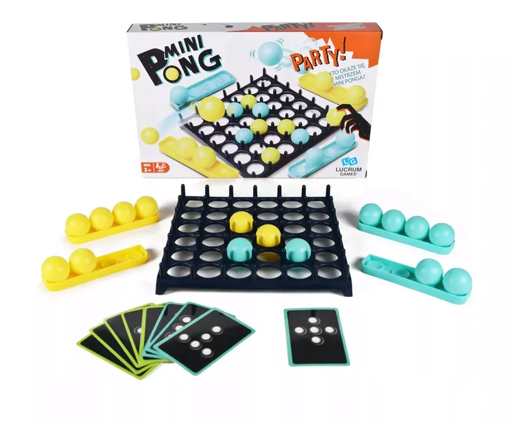 W grze MiniPong twoim zadaniem będzie odbijanie piłeczki – w taki sposób, aby minimum raz odbiła się od stołu, zanim trafi w tackę. Czy to koniec? Nie! Twoim zadaniem będzie ułożenie swoich piłeczek w tacce w taki sposób, aby odtworzyły wzór z karty. Do wyboru dwie talie – zielone (łatwiejsze) oraz niebieskie (trudniejsze), które możecie dowolnie mieszać ze sobą nawzajem dla jeszcze bardziej zróżnicowanych i ekscytujących rozgrywek! Graj przeciw sobie lub drużynowo – ten, kto pierwszy zdobędzie 3 karty wygra rozgrywkę!