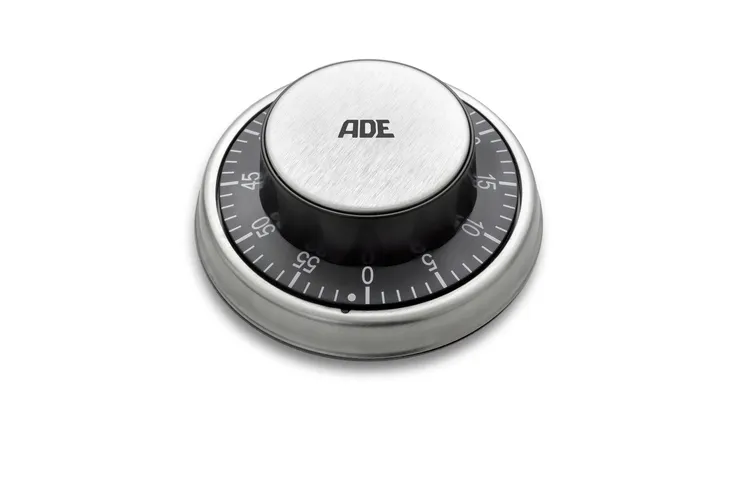 Minutnik marki ADE został wykonany ze stali nierdzewnej w matowym wariancie i tworzywa sztucznego w czarnym kolorze.