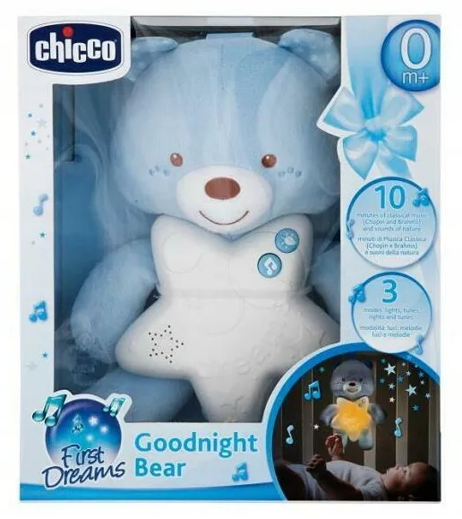 Miś na dobranoc marki Chicco został specjalnie zaprojektowana, aby ułatwić zasypianie każdemu niemowlakowi. Jego brzuszek kryje niezwykłe atrakcje - po naciśnięciu świeci oraz puszcza melodyjki , które będą towarzyszyć dziecku w drodze do krainy snu! Pomogą one maluszkowi się zrelaksować i poczuć bezpiecznie, a dyskretne i spokojne melodie nie będą go rozpraszać.Posiada bogaty wybór melodii, od klasycznych utworów Bacha i Rossiniego, kojących dźwięków natury, po spokojne newage'owe utwory, dzięki czemu Twoje dziecko codziennie do snu może kołysać inna łość zapakowana w piękne pudełko - idealne na prezent!Cechy produktu:Bogaty wybór melodii wygrywanych przez 10 minut3 tryby (świeci, świeci i gra, gra)naciśnięcie na brzuszek uruchamia efekty świetlne oraz dźwiękowedo wyboru w dwóch wersjach kolorystycznychWymaga użycia baterii: 3x AAA