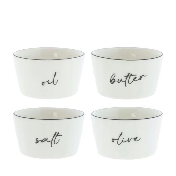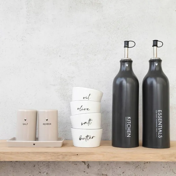 Miseczki są z czarnym serduszkiem i napisem. Minimalistyczne barwy i wzory tej zastawy sprawiają, że pasuje do każdego wnętrza.