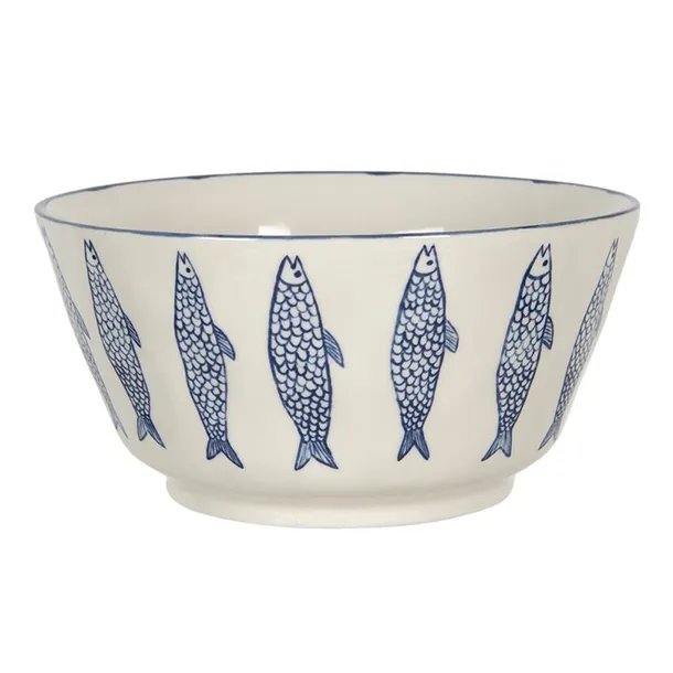 Miska z rantem pomalowanym na niebiesko. Wykończona ozdobnymi niebieskimi rybami. Wykonana z ceramiki w kolorze kremowym.