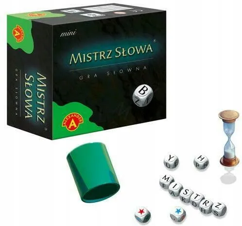 „Mistrz słowa” to pasjonująca gra słowna dla 2 -10 graczy. w trakcie swojej kolejki każdy z graczy stara sie jak najszybciej ułożyć słowo z literek znajdujących sie na wyrzuconych z kubka kostkach. Czas odmierzany jest zawsze przez klepsydrę. Po ułożeniu słowa określa się jego wartość punktową (wg podanej w instrukcji skali) i wpisuje do rubryki gracza w załączonym do gry notesie. Zwycięzcą zostaje ten kto