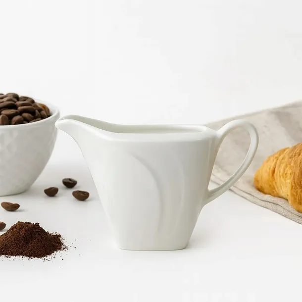 Wykonany z białej, twardej porcelany o podwyższonych parametrach jakościowych, produkt cechuje się trwałością i odpornością na codzienne użytkowanie. Mlecznik można bezpiecznie myć w zmywarce oraz używać w kuchence mikrofalowej, co czyni go niezwykle praktycznym wyborem do nowoczesnej kuchni.