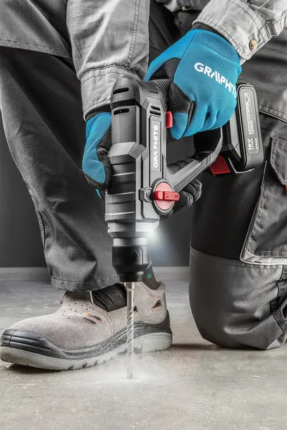 Młotowiertarka SDS+ GRAPHITE, współpracująca z akumulatorami 18V Li-Ion GRAPHITE Energy+. Posiada 2 funkcje: wiercenie oraz wiercenie z udarem elektro-pneumatycznym. Konstrukcja młotowiertarki odznacza się kompaktowym kształtem, zbliżonym do wymiarów wiertarko-wkrętarki oraz niską wagą. Elektronarzędzie zapewnia energię udaru 0.8J, optymalną także dla wiercenia w twardszych materiałach budowlanych. Częstotliwość udaru wynosi 0-5000 min?1,a prędkość obrotowa 0-900 min?1. Maksymalna średnica wiercenia w betonie wynosi 10 mm, w stali 8 mm, w drewnie 16mm. Młotowiertarka posiada możliwość zmiany kierunku obrotów wrzeciona oraz możliwość stopniowej regulacji prędkości za pomocą przycisku włącznika. Miejsce pracy jest doświetlane za pomocą diody LED. Młotowiertarka posiada funkcję "click" do szybkiego mocowania wiertła. Rękojeść główna pokryta jest antypoślizgową nakładką, dzięki czemu elektronarzędzie pewnie leży w dłoni. Marka GRAPHITE spełnia oczekiwania profesjonalistów.
