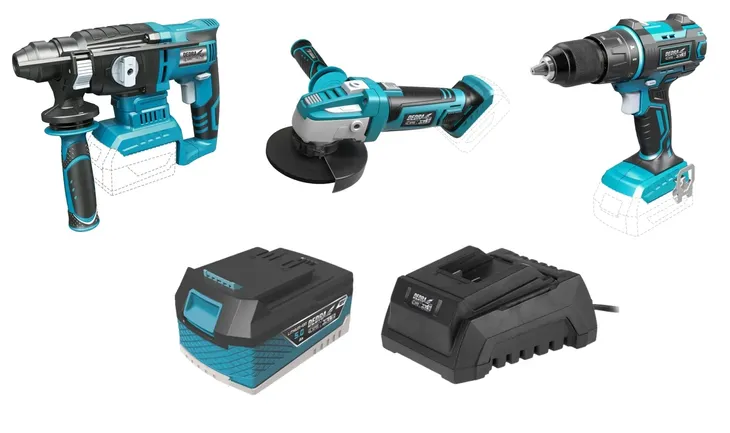 - Dedra - Zestaw narzędzi akumulatorowych (Wiertarko-wkrętarka udarowa, młot udaraowo-obrotowy, szlifierka kątowa, 1 x akumulator 5.0Ah, ładowarka)
