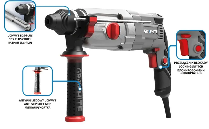 Młotowiertarka SDS+ 710 W, 2,6J, walizka 58G537 GRAPHITE to nowoczesne urządzenie klasy SDS+, charakteryzujące się mocą 710 W. Solidna, czterofunkcyjna młotowiertarka polecana jest do rozmaitych prac budowlanych, montażowych i instalacyjnych. Oferuje: