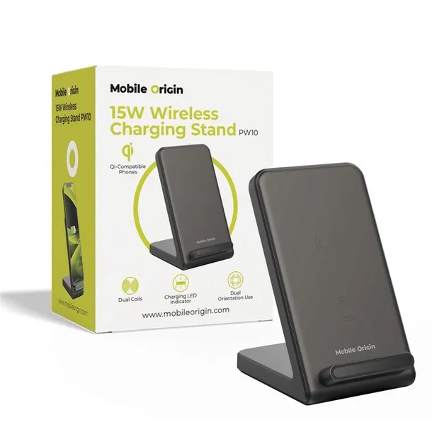 - The Mobile Origin 15W Wireless Charging Stand PW10 offers a powerful and practical solution for charging all Qi-compatible phones. With support for fast wireless charging up to 15W, it allows you to use your phone in both vertical and horizontal positions, making it an ideal choice for use at home or in the office.